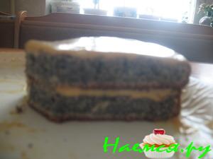 Готовый бисквит остудить, разрезать на две части, каждую пропитать чайно-сахарным сиропом. Смазать одну половинку бисквита вишневым джемом, затем выложить половину крема и накрыть второй половинкой бисквита.