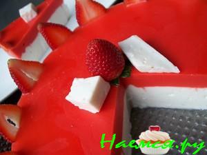 В середину насыпаем слегка размороженную бруснику(перед применением бруснику промыть прохладной водой и обсушить) до уровня "творожного забора",заливаем сверху приготовленным муссом и ставим в холодильник до полного застывания верхнего слоя.