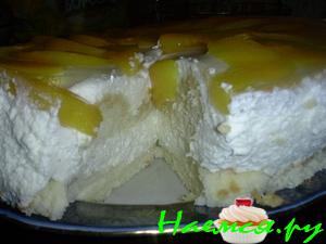Готовим начинку. Желатин замочить в лимонном соке (если его будет маловато, добавить водички). Фрукты, если консервированные, отцедить от сиропа, если крупные - порезать. Творог взбить с сахаром, ликером и ванилью. Набухший желатин растопить на водяной бане, смешать с творогом, убрать ненадолго в холодильник. Сливки взбить. Смешать начавшую застывать творожную массу со сливками и фруктами. Выложить начинку в форму, слегка утрамбовать, чтобы не было пустот, разровнять верх и убрать в холодильник минимум на 4 часа.