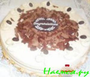 Крем: проварить на водяной бане до загустения взбитые с сахаром яйца. Взбить масло, ввести в масло остывшую яичную смесь, заваренный 3ст.л. кипятка кофе и ложечку коньяка по желанию. Взбить крем до однородного состояния. Готовый крем нанести на коржи, пропитанные слегка кофе.