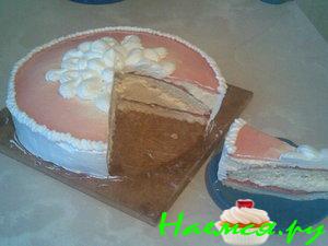 все ингредиенты смешать вместе,смесь получиться форму(у меня круглая)влить эту смесь в неё и поставить в духовой шкаф,при температуре 180гр.выпекать.Когда бока торта подрумянятся,а внутренность ещё белая,вынуть торт обмазать сверху немного сметаной и поставить ещё на 10 минут,выключить духовой шкаф,а торт можно оставить в духовке.Взять желе залить 400гр.кипятка на 100гр.порошка желе,когда торт остынет залить остывшим желе можно полужидкой.Взять нарезанные фрукты(у меня были бананы,персики,яблоки)Торт поставить в холодильник.