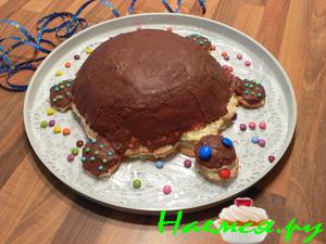 Выпеченые лепешки выкладываем в виде панциря, головы лапок и хвоста. Каждый слой смазываем кремом, а самый верхний поливаем глазурью.