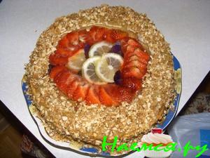 Намазать каждыи корж, сверху посыпать одним раскрошнным коржом.