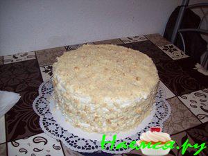 Я раскатываю тесто на бумаге для выпечки,посыпая её мукой,накалываю вилкой и выпекаю до светло-золотистого цвета.Вытаскиваю и сразу образаю по тарелке.Выкладываю на блюдо для торта и смазываю кремом,в это время уже подоспевает и следующий корж.И так весь торт.Верх и бока смазываю кремом.Из обрезков делаю крошку и посыпаю верх и бока орта крошкой.