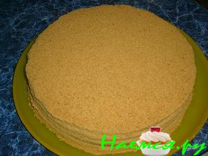 Охлажденные коржи перемазываем, чередуя заварной со сметанным кремом. На шесть коржей, получается, 3 раза мажем заварным кремом и 2 раза сметанным. Удобно сначала перемазать заварным кремом, соединив коржи по 2, а потом сметанным.