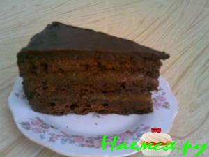 3. Разрежьте остывший бисквит поперек на 2 коржа и нижний намажьте абрикосовым джемом. Накройте вторым коржем. растопите оставшийся шоколад и масло. Полейте полученной глазурью торт, распределите ее ножом-лопаткой по поверхности и бокам изделия. Спустя 20 минут переложите его на сервировочное блюдо.
