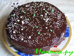 Когда всё немного застынет, соединить два коржа, для этого аккуратно перевернуть корж со сгущёнкой на сливки в разьемную форму, оставить торт в холодильнике до застывания, лучше на ночь. Торт вырезать из формы и украсить сливочным кремом или просто посыпать какао и сахарной пудрой, а можно просто шоколадом, но это как оказалось уже перебор.