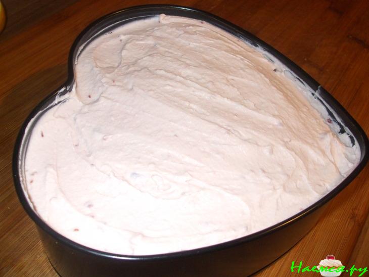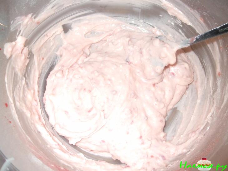 Маскарпоне смешать с полученным ежевичным соусом, соком лимона, сахаром, сливками и закрепителем сливок и хорошо взбить до загустения.