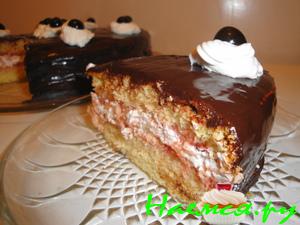 нагреть сливки до 90".но не дать закипеть.поместить нарезанный кусочками шоколад.хорошо размешать.добавить масло и опять размешать.дать остыть и нанести на поверхность торта и бока.украсить торт.один/я пекла два/я украсила шоколадными чипсами.второй чипсами и глазированной вишней.