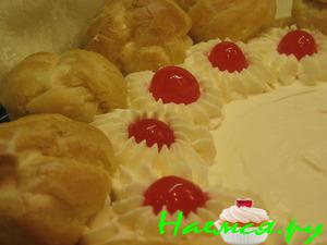 Заполни кремом заварные шарики.Их выложить сверху на спираль(приклеивая кремом).