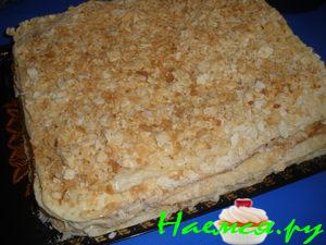 Раскатываем корж, накалываем его вилкой и выпекаем в духовке при 180 градусах до зарумянивания, вынув его из духовки, смазываем кремом и так продолжаем делать, пока не закончатся коржи и крем. Пару коржей оставьте для посыпки, раскрошить их и посыпать последний смазанный корж кремом и бока.