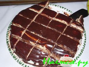 Тесто: 1 стакан сахара, 1 стакан сметаны, 3-4 стакана муки, пол ч.л. погашеной уксусом соды, 2 ст. л. какао.