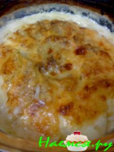 Сковороду натереть чесноком и смазать маргарином, выложить картофель, сверху посыпать сыром