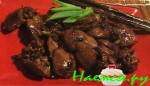 Смешать 2ст.л. соевого соуса,подслащённое вино и куриную печень. Оставить мариноваться на 20-30 мин, время от времени помешивая.