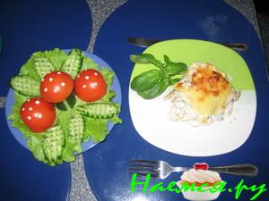 Перекладываем в огнеупорную посуду.Сверху кладём слой сметаны.