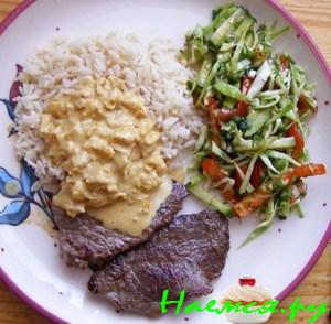 В форму для запекания выкладываем мясо, сверху лук, поливаем соусом и присыпаем миндалем.