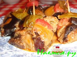 Помидоры порезать кольцами, перец порезать на 2-3 части. Выложить сверху на баклажаны.