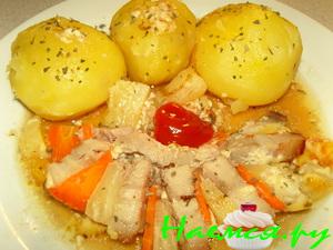 На мясо выкладываем слой кусочков ананаса, затем посыпаем сыром и тмином, сверху раскладываем замороженную вишню. Запекаем в духовке при 200* 40-50 мин.