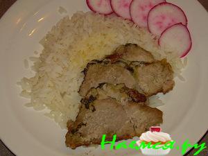 Нарезать свинину большими кусками, сложить в посуду и замариновать: пересыпать солью, перцем, луком и кусочками лимона, закрыть посуду крышкой и дать настояться при комнатной температуре 5 часов.