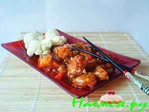 5) На овощи выливаем смесь сахара, соевого соуса и уксуса. Перемешиваем, ждем, когда закипит. В получившийся соус кладем куски жареной свинины. Перемешиваем так, чтобы все кусочки были покрыты слоем жидкости. После можно выкладывать на блюдо и угощать всех вкусным и ароматным блюдом.