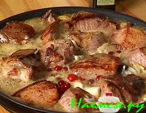 Берем телятину,рубленную на куски прямо с костью.Кладем ее на разогретую сковородку с растительным маслом.Солим,перчим и на сильном огне быстро обжариваем с двуж сторон.Лук,чеснок крошим-кладем к мясу.Обжариваем все вместе.Затем выкладываем мясо в толстостенную посуду,а в сковороду с луком и чесноком кладем столовую ложку муки,обжариваем несколько минут и заливаем бульоном.Можно просто кипяченной водой.Даем покипеть,постоянно помешивая и сливаем к мясу.Ставим тушиться минут на 20-30.За это время режем сладкий перчик полосками,острый перчик-колечками прямо с семенами(так будет острее)и произвольно-помидоры.Все овощи закладываем поверх мяса,закрываем крышкой и тушим минут 10-15.Под конец кладем хмели-сунели и резанные петрушку и кинзу.Даем прокипеть минут 5-готово.В ресторане это блюдо подают с картофелем-фри,а мне больше нравится или с рисом,или с пастой типа "бантики".
