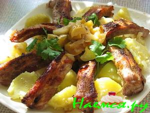 На противне разложить фольгу, в середину выкладываем маринованные рёбрышки, а вокруг выкладываем порезанную картошечку смешанную с приправами и солью.