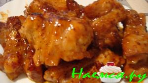 Ребрышки подготовить к жарке (обмыть, высушить, натереть горчицей и оставить на 1 час, смыть горчицу). Обжарить ребрышки до румяной корочки.