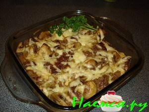 обжариваем 2 мелко порезаных луковицы и добавляем отваренные грибы.Поджариваем грибочки с луком,до полного удаления влаги и легкоко подрумянивания и отправляем к мясу.