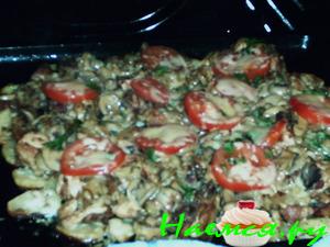 На смазанный протвинь выкладываем слоями картофель,майонез,свинину, майонез,помидоры, майонез и поставит в духовку на 20 минут при т=150-200 гр. За 5 минут до готовности посыпать натертым сыром и запечь до румяной корочки.