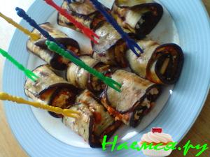 В порционное блюдо положить полоски баклажанов, на них- рис с фаршем, закрыть крест-накрест и в духовку на 10 минут при 180 гр.