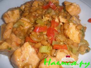 2.Фасоль сливаем, промываем водой, добовляем к мясу.