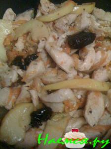 Курицу начинить дольками айвы и грейпфрута,положить в рукав для запекания.