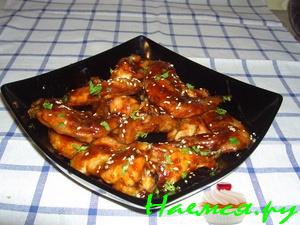 Куриные крылышки уложить в кастрюлю - добавить соус Терияки и обильно посыпать приправами. Добавить соль и перец.