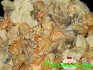 Печенку обвалять в муке с солью и быстро обжарить на большом огне до появления корочки, добавить херес (можно заменить 30 мл коньяка), выпарить до исчезновения запаха алкоголя, добавить майоран (если используете сухой – добавляйте вместе с вином), перемешать и прикрутить огонь до среднего. Добавить к печенке сливки, грибы с луком и яичную соломку, перемешать, посолить и поперчить по вкусу. Прогреть 3-4 минуты и сразу подавать. На гарнир хорошо подойдет крупная паста (пенне или рожки).