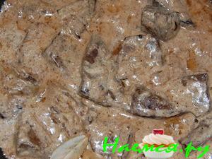 Печенку вымыть, очистить от пленки и протоков и нарезать на кусочки-брусочки.