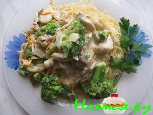 разогреть сковороду с оливк маслом, высыпать горчицу, рубленый чеснок, несколько мелких соцветий брокколи, нарзать мелко помидорку,выложить в соус, приправить по вкусу, добавить морепродукты, обжарить перемешав, сдобрить сливками, красным перцем(по желанию) базиликом,