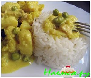 Положить разобранную на мелкие соцветия цветную капусту, протушить, добавить горошек и довести до готовности.