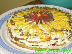 Выкладываем их на блюдо, чередуя и перемазывая майонезом с зеленью.