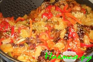 В сковороде разогреть немного растительного масла, заложить морковь, обжаривать в течении 7 -10 минут, далее положить в сковородку лук, помидоры, перец, тушить ещe около 5 -7 минут, в конце добавить помидоры, ананасы, мeд, соевый соус, соль и перец и 1 ст. л. горчицы.