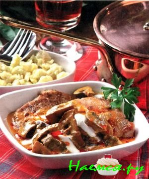Потушите квашеную капусту с 20 г растительного масла. Одновременно приготовьте фарш из свиной лопатки, обжарьте его на растительном масле с луком и красным перцем, затем добавьте пареный рис. При приготовлении данного блюда можно использовать остатки жаркого или вареного мяса. Капусту поместите на дно, положите слой фарша, затем снова капусту в 3-4 ряда, полейте сметаной. Сверху на слой капусты можно выложить нарезанную на тонкие ломтики колбасу (и даже нарезанные на ломтики вареные яйца), вылить сметану, смешанную с соком от обжаренного фарша. Затем выложите тонкие ломтики сала и выпекайте в горячей духовке в течение 20 минут.