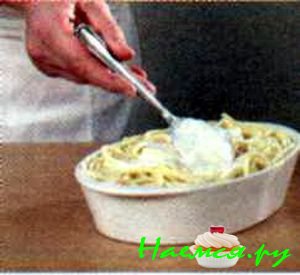 Приготовьте гуляш из мяса, добавьте томатную пасту и пропустите через мясорубку. Отварите макароны в соленой воде (в течение 15 минут), затем слейте воду, ополосните готовые макароны теплой водой и обжарьте немного на жире или растительном масле. Затем выложите макароны и гуляш слоями в большую огнеупорную форму, слои сбрызнете сметаной. Выпекайте в горячей духовке в течение 20 минут. При подаче на стол посыпьте блюдо тертым сыром.