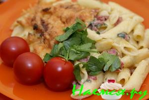 Регатони с вешенками и ветчиной на сливочной основе