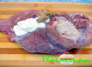 - Замаринованную мякоть аккуратно завернуть в фольгу и положить ее на противень. Противень отправить в предварительно нагретую духовую печь на полтора часа.