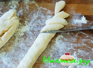 - Затем готовой тестовой массе придайте форму колбаски.