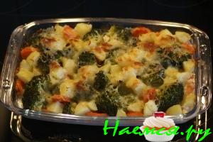 Выложить в огнеупорную форму слоями картофель,бекон с луком и курицей,брокколи.