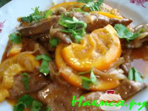 - В сковороду налить ложку растительного масла, довести до кипения и полить соусом говяжью печень с апельсинами. Любители острого в соус могут положить ложку горчицы и налить 2–3 ложки сухого вина.