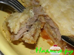 Мясо обмакиваем в смесь аджики с майонезом и укладываем в эмалированную пасуду,посыпая каждый слой мелким лукам.