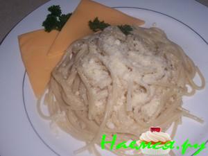 3. в подсоленную кипящую воду бросить спагетти на 3 мин. не доварить. "высушить" спагетти в дуршлаке.