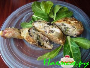 наполнить свободно,не уплотняя сильно,так что бы при жарке не полопалась кожа, придать форму нашим "окорочкам"...