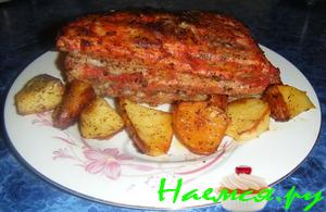 Кусочки свинины выложить в форму или в смазанный растительным маслом противень,разровнять,сверху положить слой порезанного на мелкие кубики картофеля.